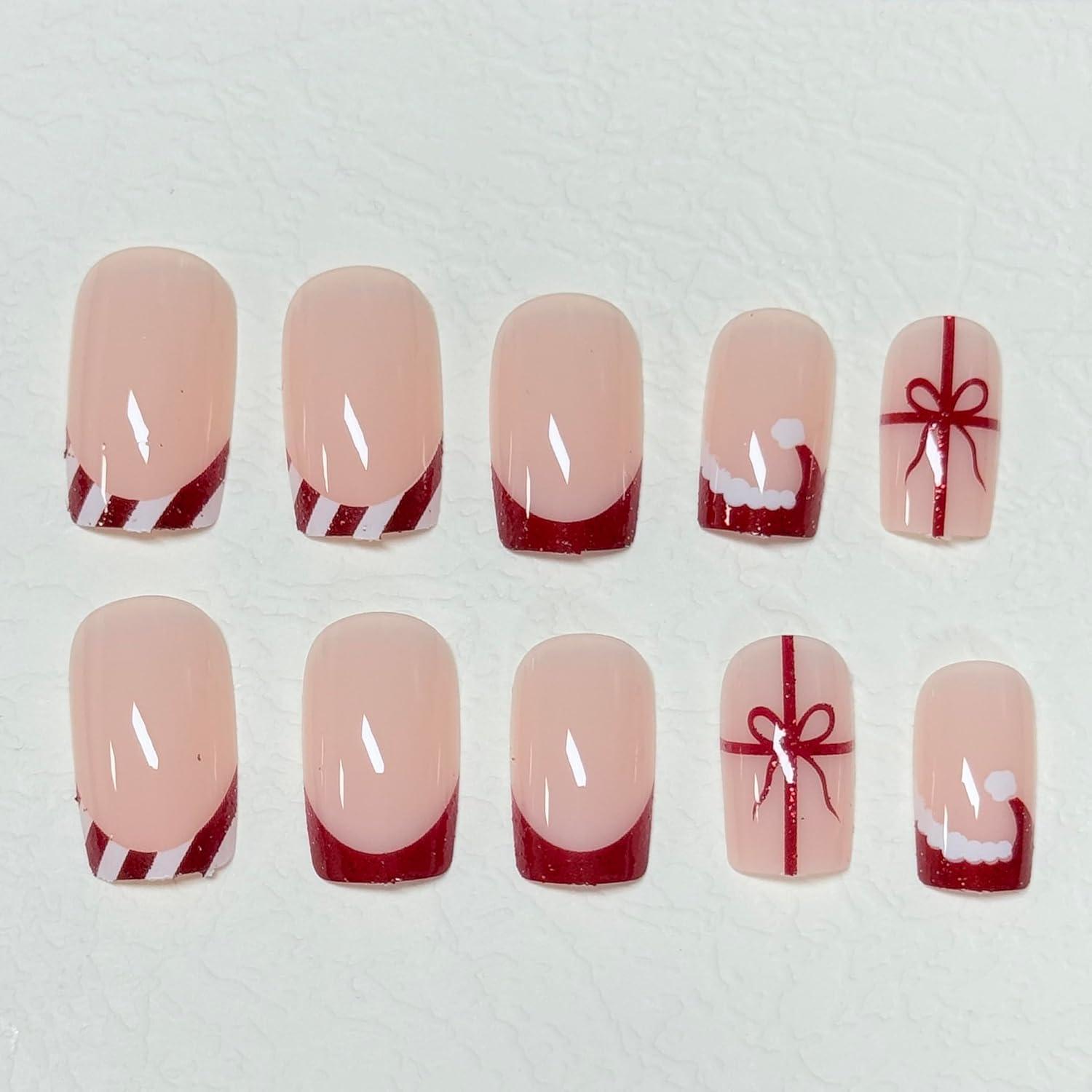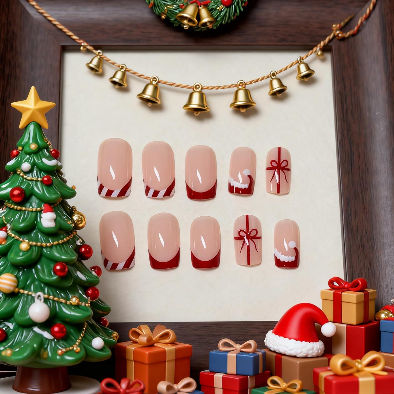 BABALA Christmas Press on False Nails Short Square, 24Pcs Festive Red Gift Santa Hat Fake Nails, Reusable French Tip Glue-on Acrylic for Women Holiday Party, Cute Xmas Artificial Nails Set