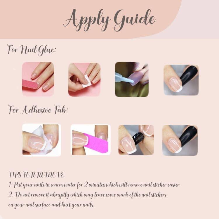 【Lasting Effect】Wear Them Weeks Straight or A Few Days – You Decide!If you want to get more than 14 days long lasting, we recommend using nail glue and adhesive tabs together. If you want to change the design weekly, only using glue is best choice. Adhesive tab is best for a date night or a little event