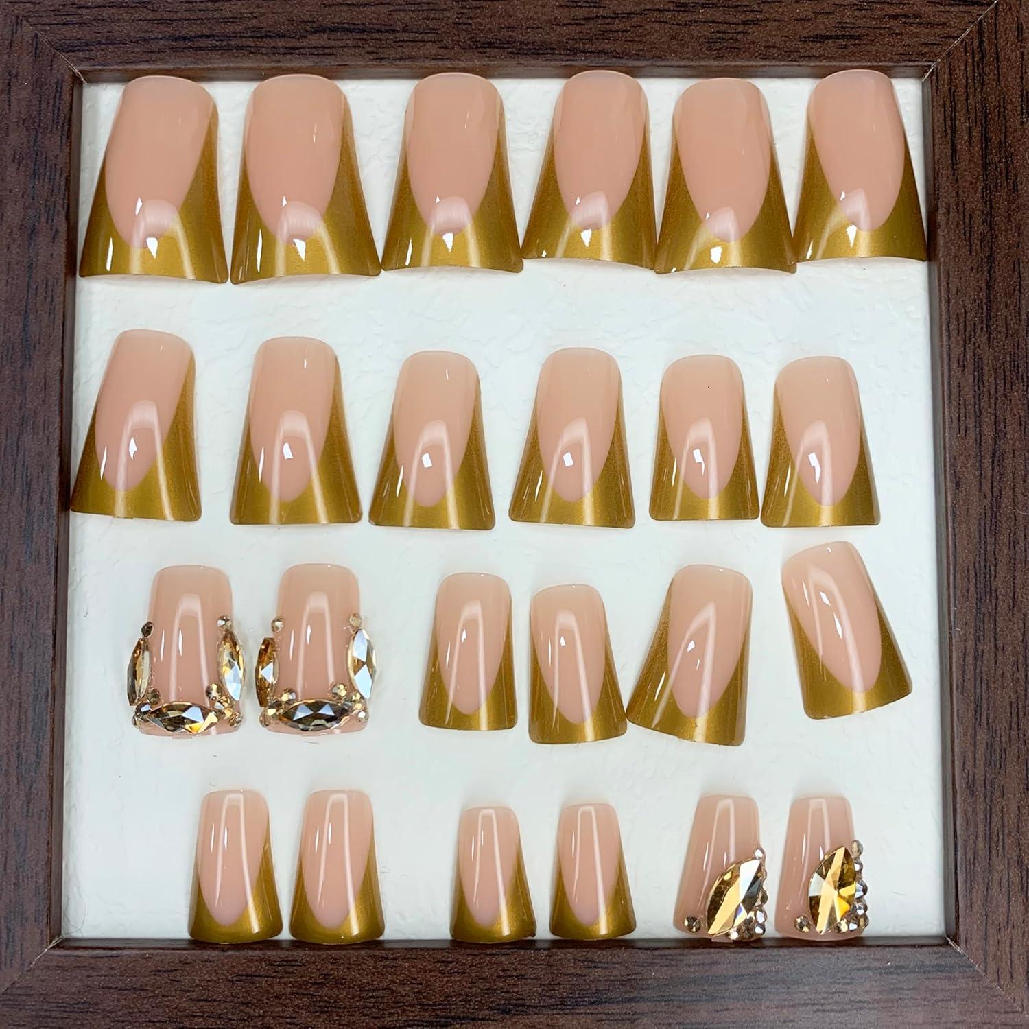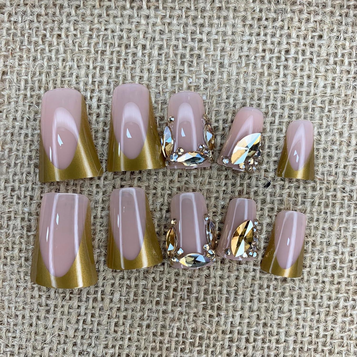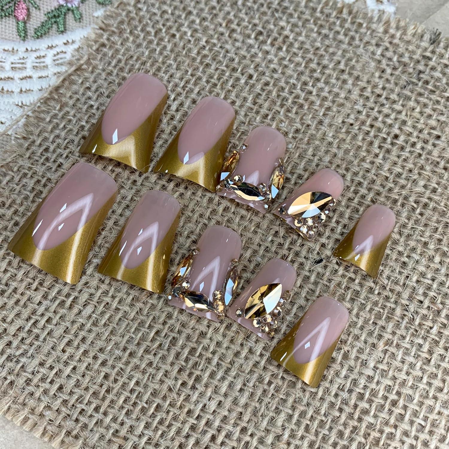 imageBABALAL Curved Press on Nails Extra Long Square Fake Nails Blue Glue on Full Cover Cheetah Leopard Flower 3d Handmade Acrylic Women Reusable Stick on 20PCS Custom DIY with CharmANF01gold