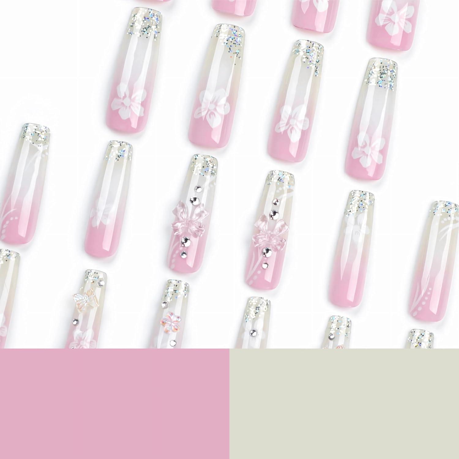 BABALAL Pink Press on Nails French Tip Fake Nails – Long Square, Ombre, Zebra Print, French Tip, with Charm, 3D Flower, Handmade, 24Pcs Glossy Full Cover Acrylic False Nails(CRJL01)