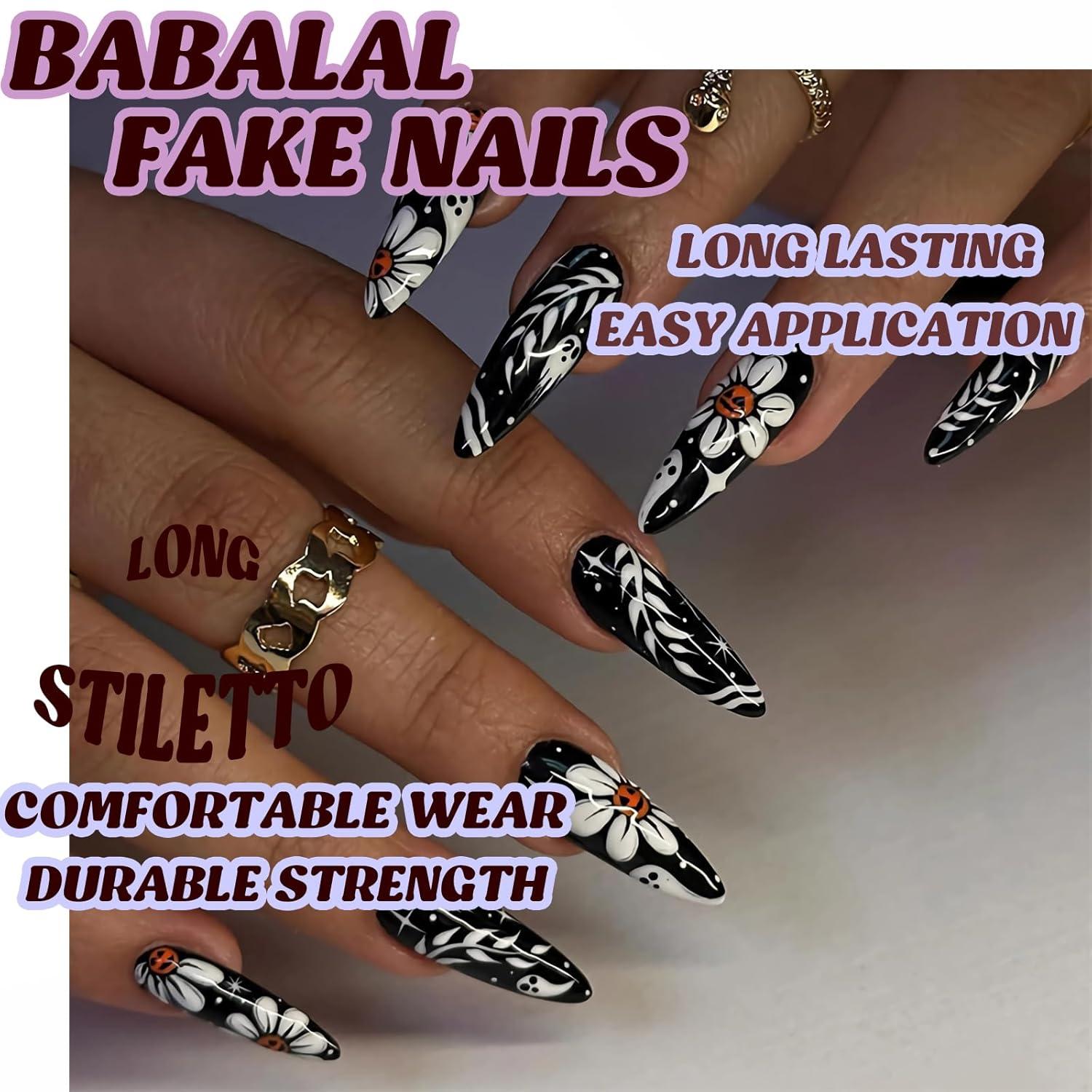 imageBABALAL Long Press on Nails Square Fake Nails Black White Gothic Glue ons Polka Dot Design Ghost Horror Halloween Pumpkin Bow Charm Trendy 24Pcs Glossy Acrylic False NailsANHA201long