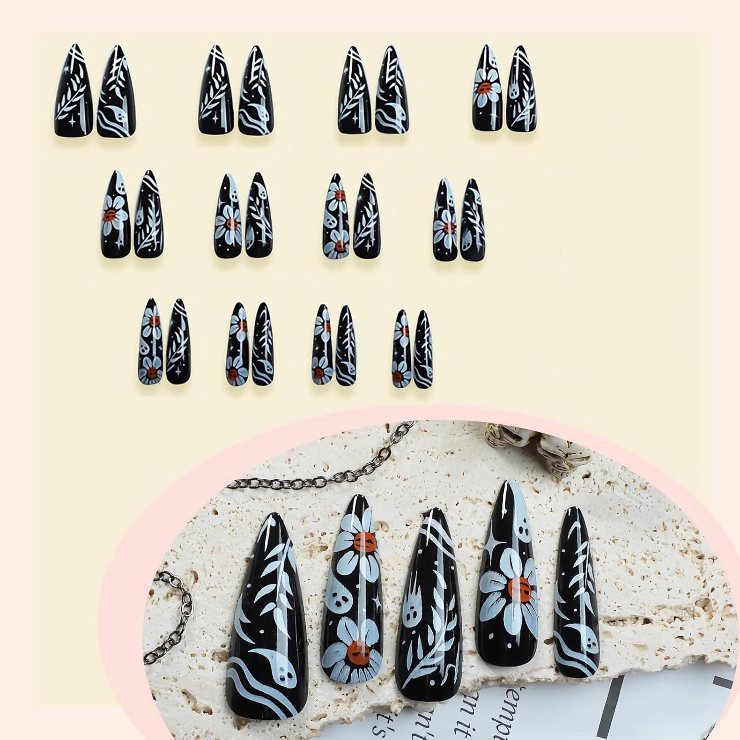 BABALAL Long Press on Nails Square Fake Nails Black White Gothic Glue ons Polka Dot Design, Ghost Horror Halloween Pumpkin, Bow Charm Trendy 24Pcs Glossy Acrylic False Nails(ANHA201horror)