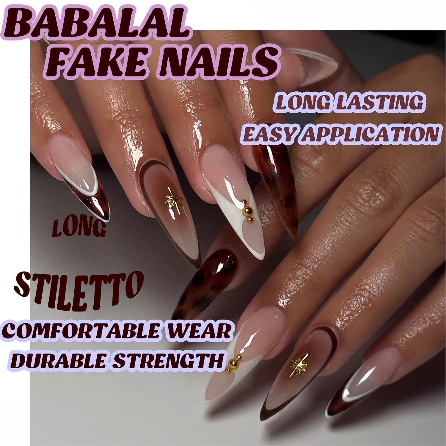 imageBABALAL Long Stiletto Press on Nails White Fake Nail French Tip Glue on Design Supplies Art 24Pcs XL Glossy Acrylic False Nails with CharmBNN02brown