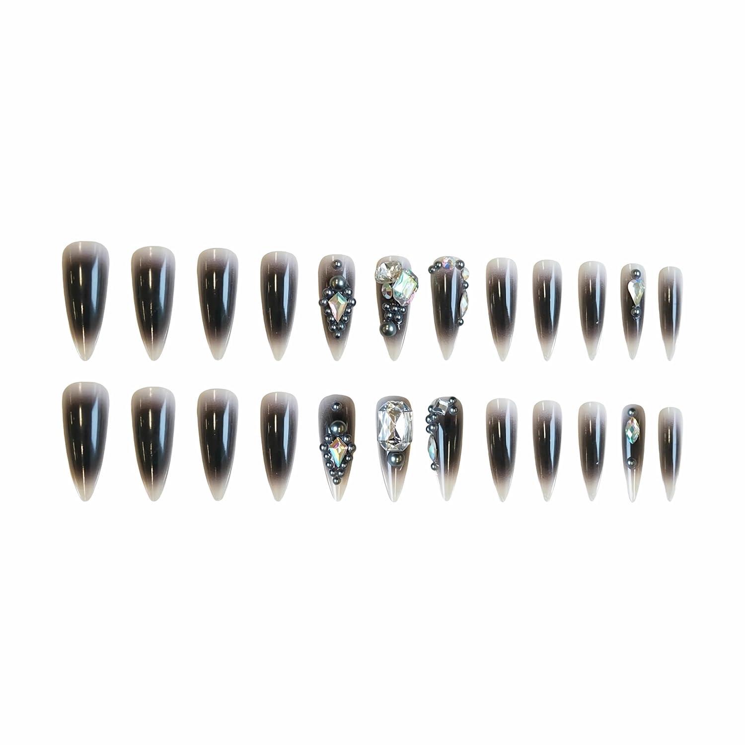 BABALAL Long Stiletto Press on Nails White Fake Nail French Tip Glue on Design Supplies Art 24Pcs XL Glossy Acrylic False Nails with Charm(BNN03gothic)