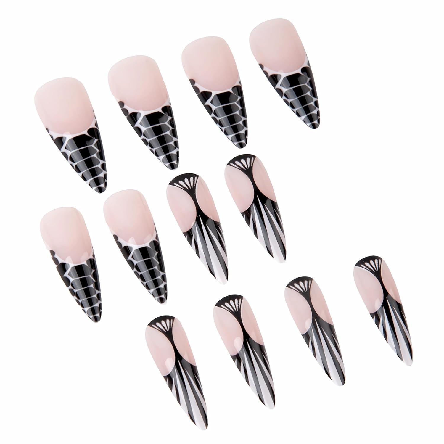 BABALAL Long Stiletto Press on Nails White Fake Nail French Tip Glue on Design Supplies Art 24Pcs XL Glossy Acrylic False Nails with Charm(BNN04black)
