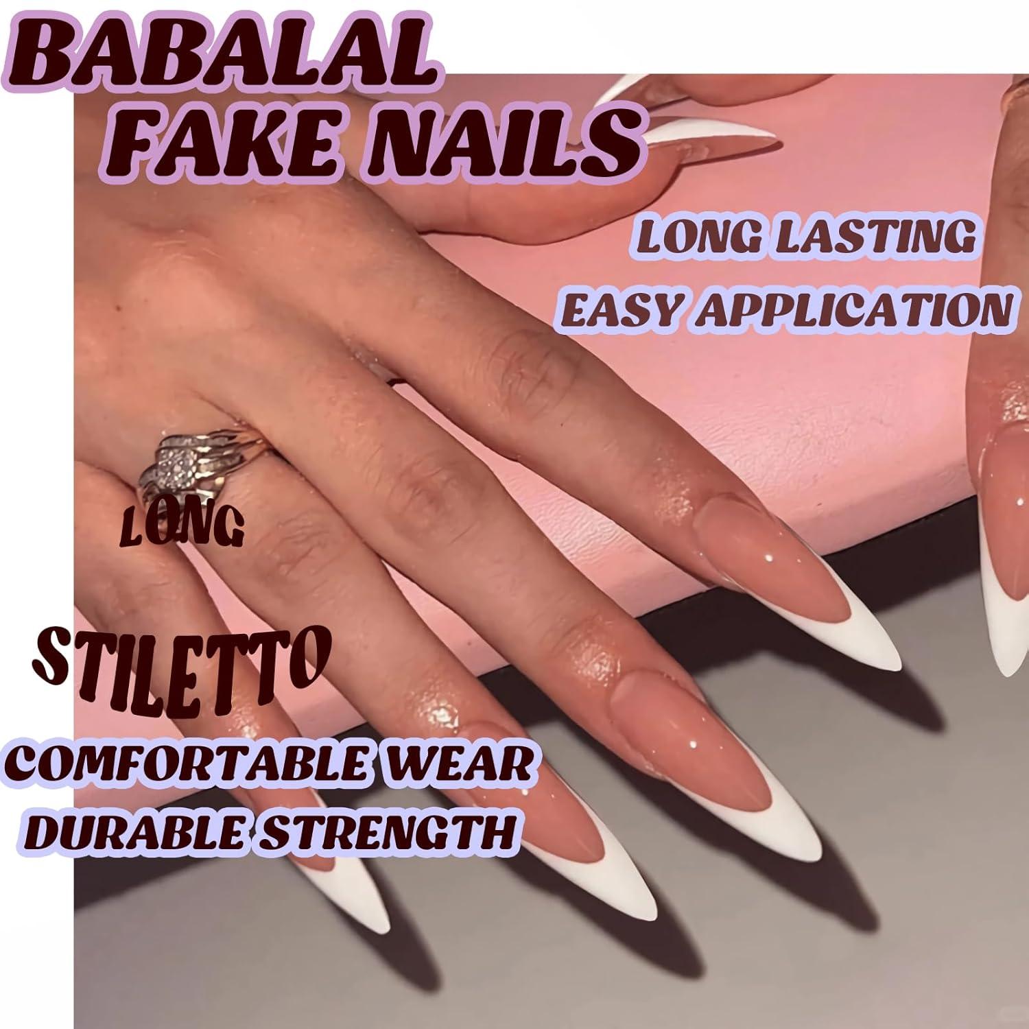 imageBABALAL Long Stiletto Press on Nails White Fake Nail French Tip Glue on Design Supplies Art 24Pcs XL Glossy Acrylic False Nails with CharmBNN15