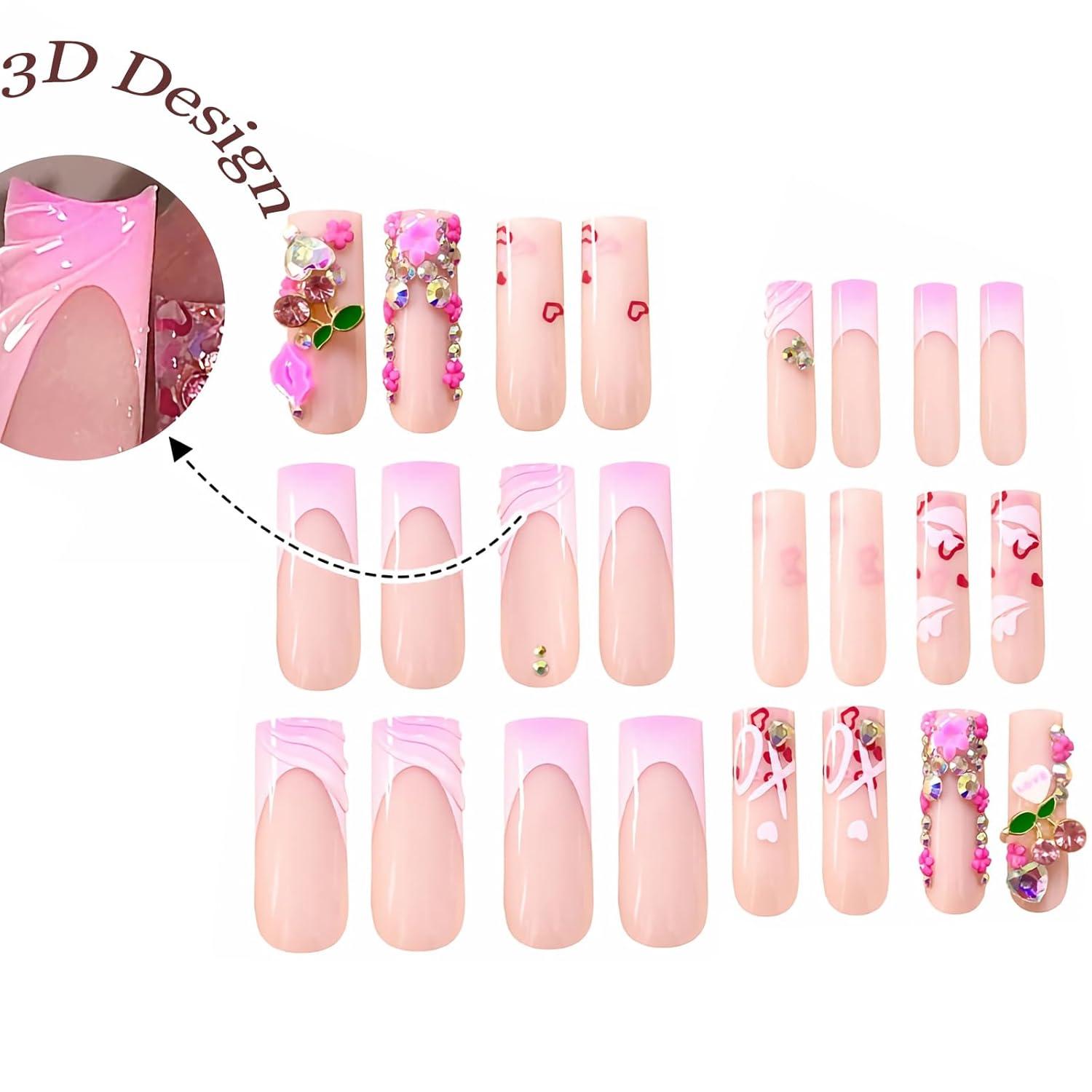 BABALAL Pink Press on Nails French Tip Fake Nails - Long Square, Ombre, Zebra Print, French Tip, with Charm, 3D Flower, Handmade, 24Pcs Glossy Full Cover Acrylic False Nails(CRJL02pink)